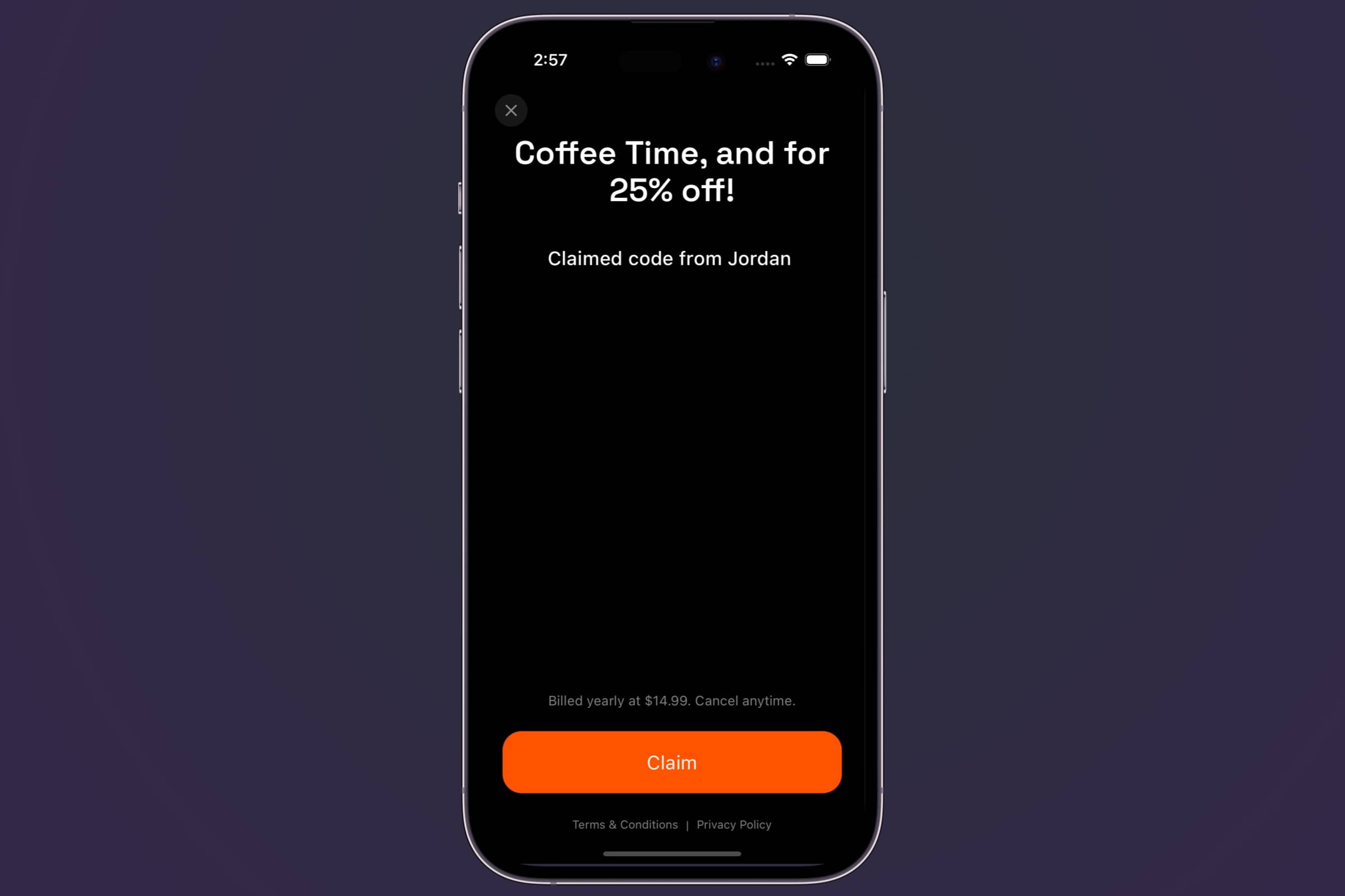 Finally, your paywall and discounted product that you setup in step #1 is shown. If they convert, you'll see all of the details in your campaign that you built for referrals, just like you would any other campaign. You can also forward events to your third party analytics service as well, as shown in the previous step.